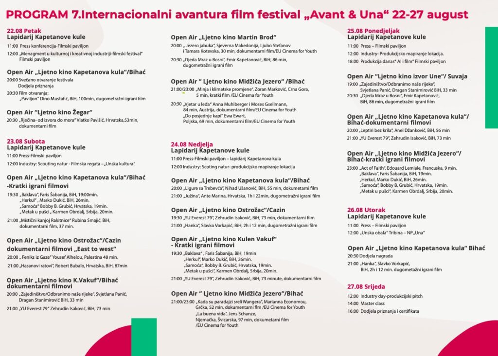 Festival će svečano biti otvoren 22. avgusta na Kapetanovoj kuli u Bihaću, premijerom dugometražnog igranog filma „Paviljon“ Dine Mustafića, a publika će imati priliku pogledati i naslove domaćih, regionalnih i međunarodnih autora poput „Mistični kanjon Rakitnice“ Rubine Smajić, „Feniks iz Gaze“ Yousefa Alheloua, „Hasanovi ratovi“ Roberta Bubala, „Južina“ Ante Marine, „Leptiri bez krila“ Anela Džankovića, „Zajedništvo“ Svjetlane Panić i Dragana Stanimirovića, „Djed Mraz u Bosni“ Emira Kapetanovića, „YU Everest 79“ Zehrudina Isakovića i mnoge druge.