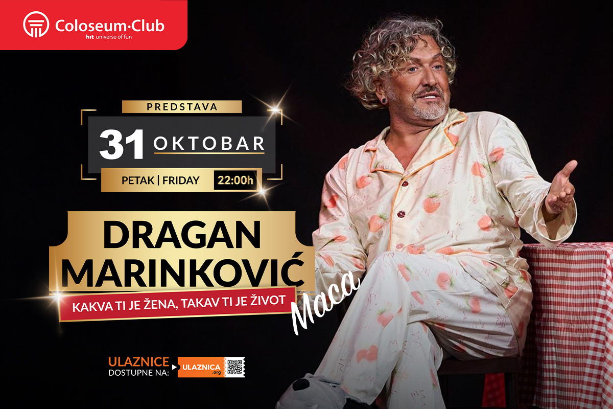 Jedan od najpopularnijih glumaca i komičara u regionu, Dragan Marinković – Maca, ponovo dolazi pred sarajevsku publiku, gdje će prvi put na sceni Coloseum Cluba izvesti svoju popularnu predstavu „Kakva ti je žena, takav ti je život“! U petak, 31. oktobra u 22:00 sata, publika će imati priliku da uživa u večeri ispunjenoj smijehom i neponovljivom energijom koju samo Maca zna prenijeti.