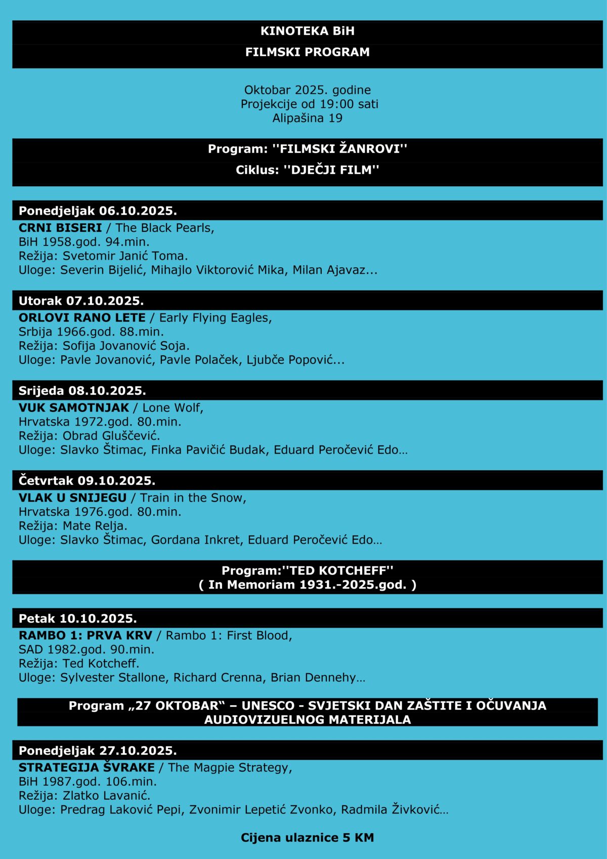 U Kinoteci BiH će se u Oktobru 2025. godine prikazati sljedeći filmovi: