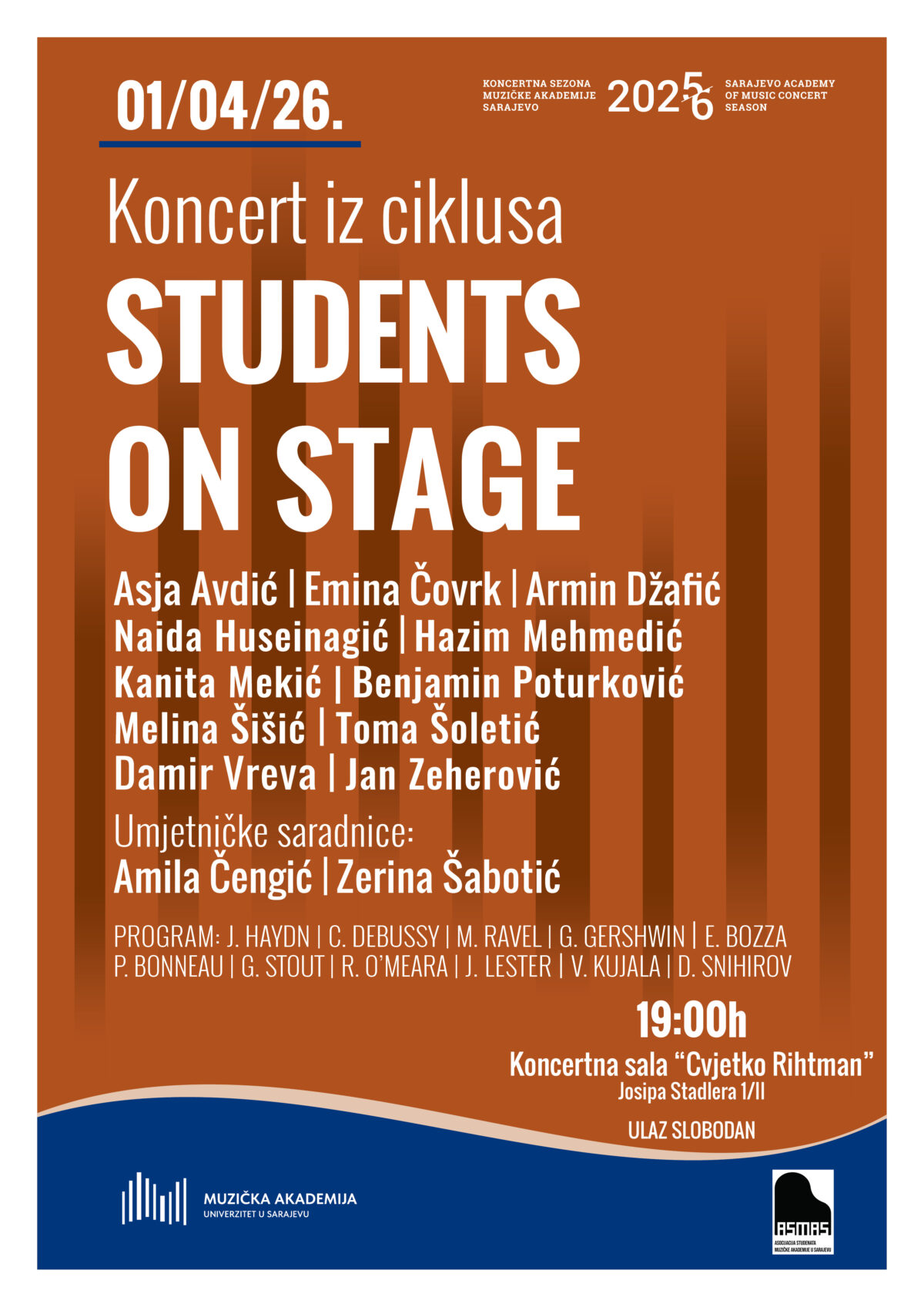 Muzička akademija Univerziteta u Sarajevu i Asocijacija studenata MAS najavljuju još jedan koncert iz dugogodišnjeg ciklusa “Students on Stage” na kojem će se u srijedu, 1. aprila 2026. godine, u Koncertnoj sali “Cvjetko Rihtman” u 19:00 predstaviti studenti svih instrumentalnih odsjeka MAS.