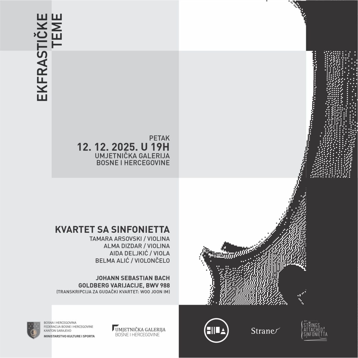 Udruženje za razvoj muzičke umjetnosti i pedagogije Strings Attached Sinfonietta najavljuje koncert u okviru projekta Ekfrastičke teme, koji se treću godinu realizuje s fokusom na istraživanje odnosa između zvuka i teksta, te na razumijevanje muzike kao poticaja za književnu interpretaciju.