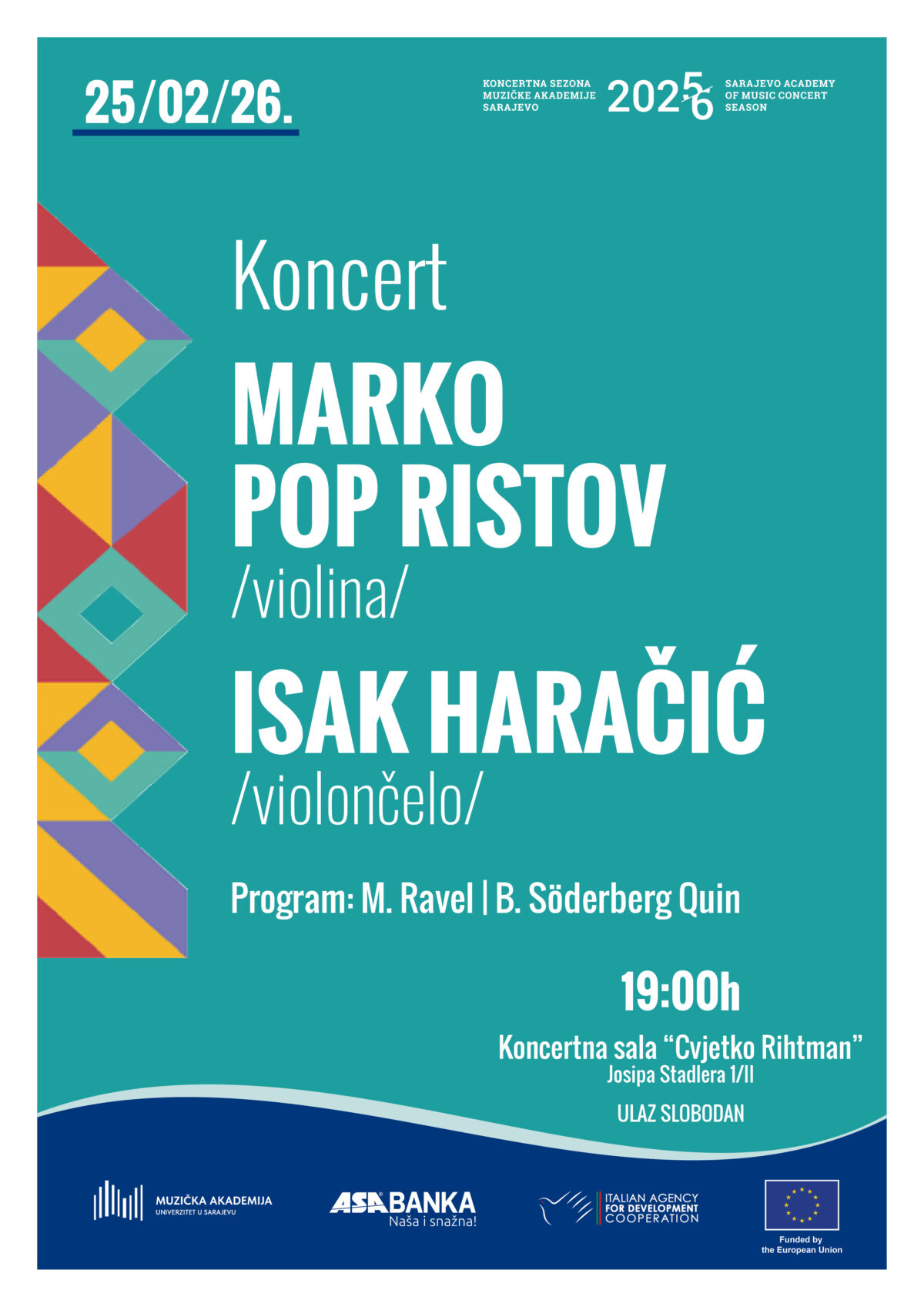 Muzička akademija Univerziteta u Sarajevu sa zadovoljstvom najavljuje koncert koji će u srijedu, 25. februara 2026. godine, u 19:00 u Koncertnoj sali “Cvjetko Rihtman” prirediti violinista Marko Pop Ristov i violončelista Isak Haračić.